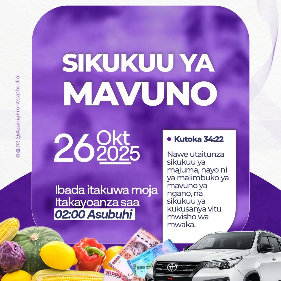 Wapendwa Washarika, tunapenda kuwakaribisha katika ibada maalum ya Sikukuu ya Mavuno kwa mwaka 2025 itakayofanyika katika viwanja vya Usharika wa Kanisa Kuu Azania Front siku ya Jumapili tarehe 26 Oktoba 2025, kuanzia saa 2 kamili asubuhi. Siku hiyo ibada itakuwa moja tu (SWA).