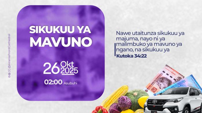Wapendwa Washarika, tunapenda kuwakaribisha katika ibada maalum ya Sikukuu ya Mavuno kwa mwaka 2025 itakayofanyika katika viwanja vya Usharika wa Kanisa Kuu Azania Front siku ya Jumapili tarehe 26 Oktoba 2025, kuanzia saa 2 kamili asubuhi. Siku hiyo ibada itakuwa moja tu (SWA).